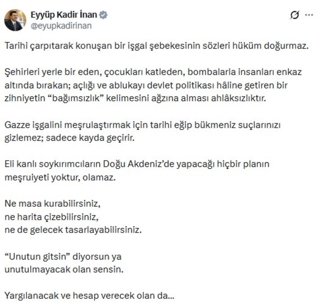 “Tarihi çarpıtarak konuşan bir işgal şebekesinin sözleri hüküm doğurmaz. Şehirleri yerle bir eden, çocukları katleden, bombalarla insanları enkaz altında bırakan; açlığı ve ablukayı devlet politikası hâline getiren bir zihniyetin ‘bağımsızlık’ kelimesini ağzına alması ahlâksızlıktır.