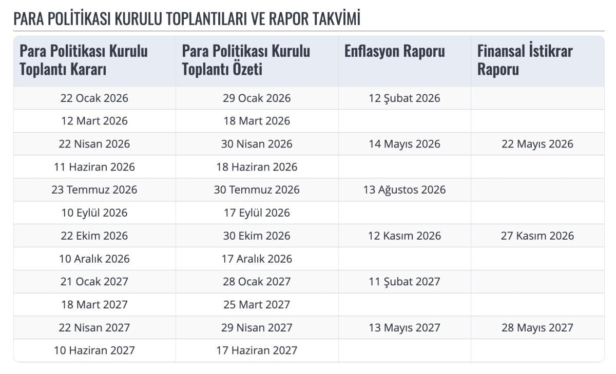 Türkiye Cumhuriyet Merkez Bankası, 2026’da yeni açıkladığı takvime göre 8 kez faiz açıklayacak, 8 kez toplantı özetini paylaşacak, 4 kez enflasyon raporu ve 2 kez de finans istikrar raporu sunacak.