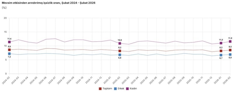 Mevsim etkisinden arındırılmış işsizlik oranı yüzde 8,5 oldu.