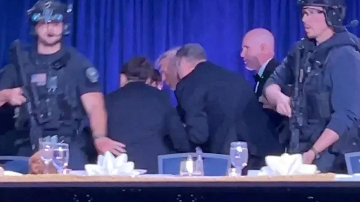 Güvenlik bariyerlerini yıkarak Trump’ın oturduğu masaya ulaşan güvenlik birimleri, ABD Başkanı ve eşi Melania Trump’ı hızla aralarına alarak salondan uzaklaştırdı.