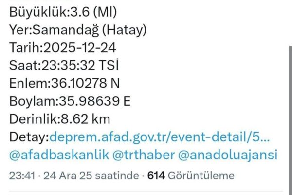 AFAD‘dan alınan bilgiye göre, saat 23.35’te merkez üssü Hatay‘ın Samandağ ilçesi olan 3,6 büyüklüğünde bir…